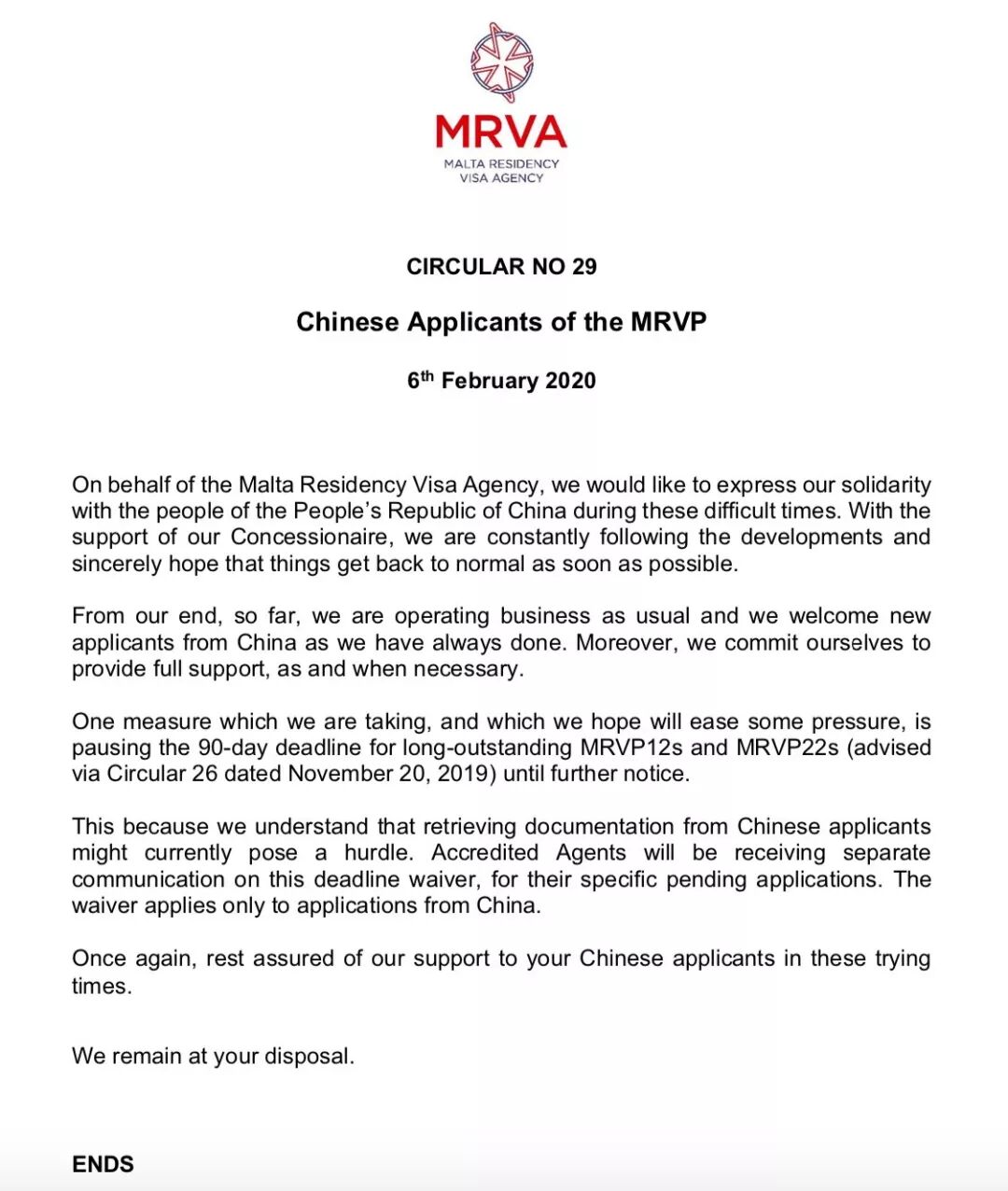 从MRVA的公文中可以看出马耳他对中国疫情的关心与深切的理解,所以才针对中国申请人暂时取消了90天未补件就撤销申请的规定。