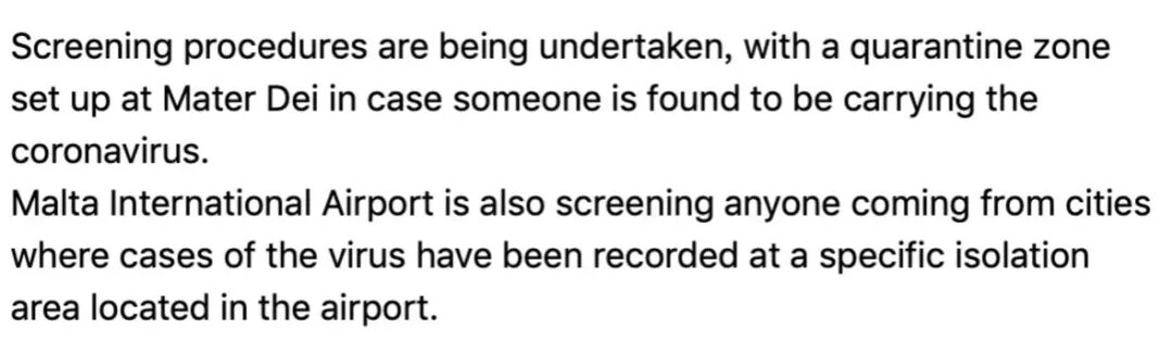 同时,马耳他国际机场也在严格筛查来自被发现疫情国的机场的旅客,严密监测,保障岛内的高度安全。马耳他国际机场等主要出入口都有标语,为从受影响地区来的旅客提供有关该疾病医疗症状的建议。