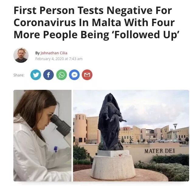截止2020年2月4日,马耳他卫生当局证实,马耳他的一个人已经接受了新冠病毒测试。测试结果为阴性,也就是说,迄今为止,该岛上尚未检测到冠状病毒。此外,马耳他对其余四人进行观察,以防出现症状。