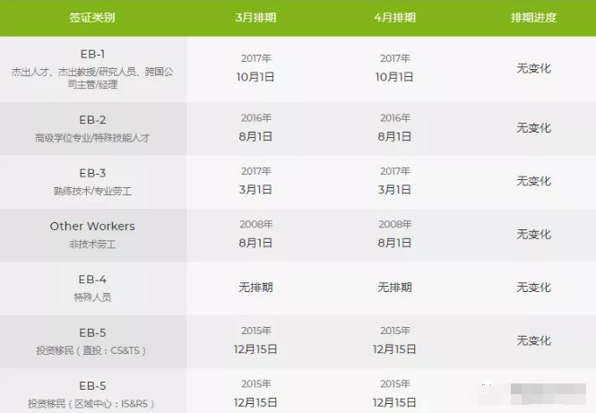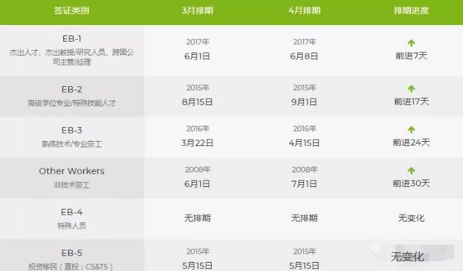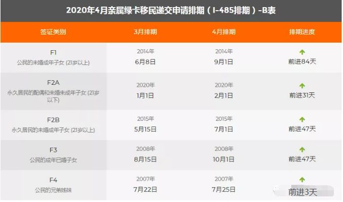 第一优先F1类(公民的成年未婚子女)推进近三个月;第二优先F2A类(永久居民的配偶及未成年子女)推进一个月;第二优先F2B类(永久居民的成年未婚子女(21岁及以上))推进一个半月;中国出生第二优先(具高等学位或特殊能力者)推进半个月;中国出生第五优先EB-5非区域中心和区域中心均原地踏步。