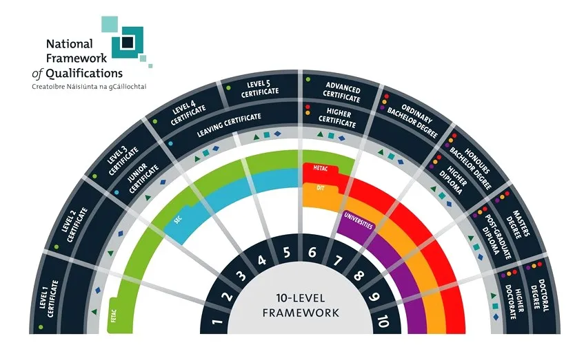 跟国内很不一样,爱尔兰没有纷繁复杂的教育机构,没有各种不同水平的考试或者文凭证书。爱尔兰在教育上的等级认证,全部统一在QQI体系内,甚至大学毕业之后颁发的学位归到QQI的1~10级里面。实际上高等教育就是从6级到10级。6级相当于国内两年制的大专,7级相当于咱们国内三年制的大专;8级相当于国内本科,9级就等于国内的研究生。简单的分级制度,就很方便终身学习,比如你今天的级别是6,那接下来你就奔着更高的数字去深造就行了。