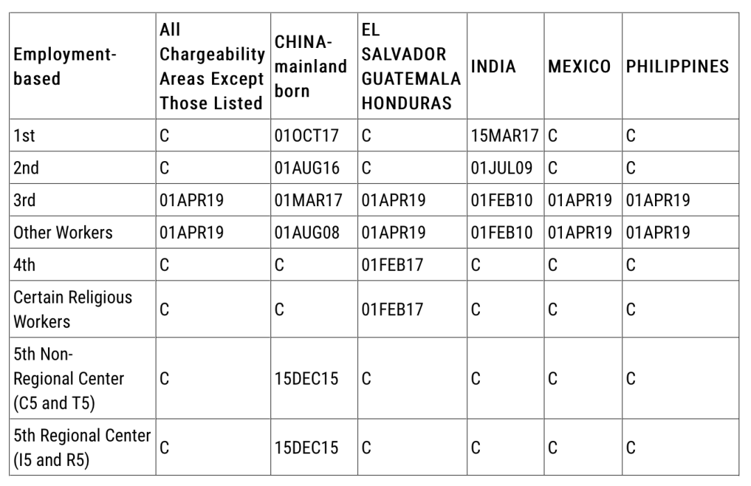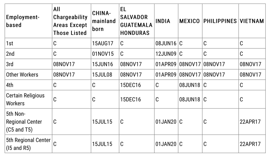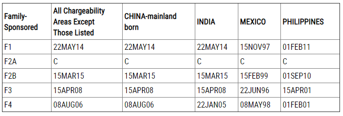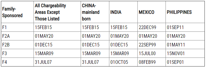 美国国务院签证办公室公布了2020年6月的签证公告(Visa Bulletin),关于职业移民(Employment-based Preference Cases)和亲属移民(Family-Sponsored Preferences Cases)排期表详情见以下表格。