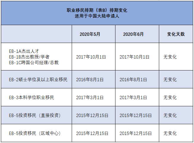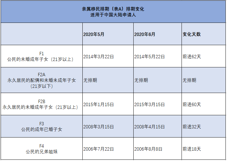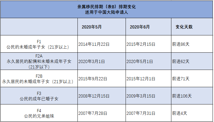 2020年6月最新美国绿卡移民排期出炉,职业移民亲属移民均有前进