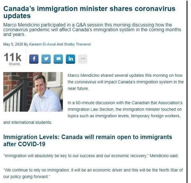 根据CIC新闻,加拿大联邦移民、难民及公民部长马克.门迪奇诺(Marco Mendicino)分享了疫情如何影响加拿大的移民系统,并且也特别提到了移民配额、临时外国工人以及国际学生等等面临的问题。