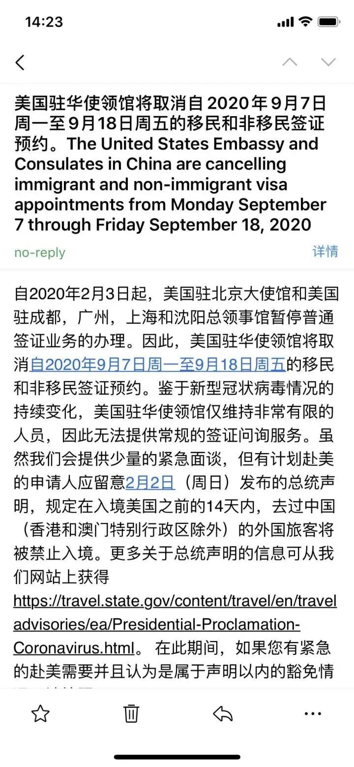 8月28日,美国驻华使领馆以邮件通知的形式通知取消所有驻华使领馆的自2020年9月7日至9月18日的所有签证预约。这是自2020年8月17日通知取消9月4日前所有签证预约,第六次通知取消面签。