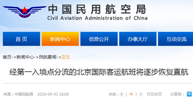 民航局9月2日发布消息称,在严格采取防控措施、严格防范输入风险的前提下,自9月3日起逐步将经第一入境点分流的北京国际客运航班恢复直航。