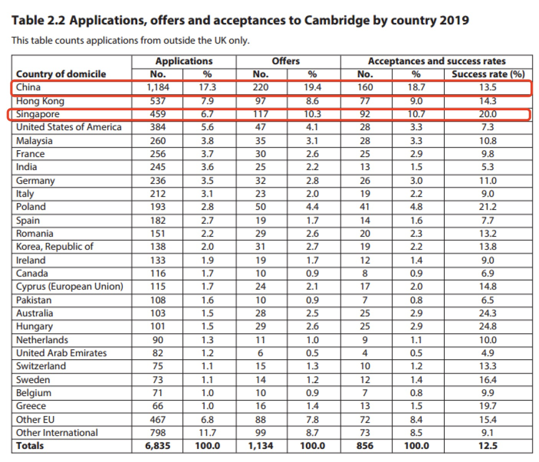 比如去年2019年,同样是申请剑桥大学,中国在读生的申请成功率只有13.5%。而在新加坡却高达20%!