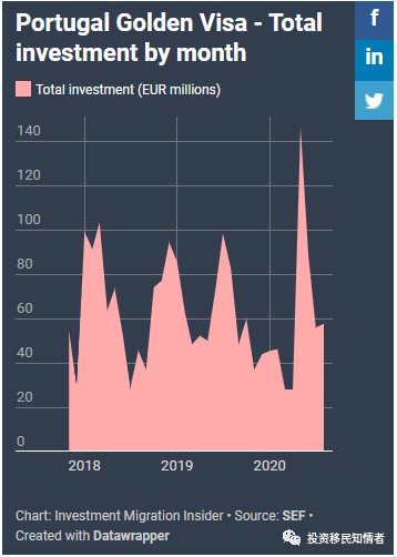 此外,今年前8个月,“黄金签证”投资总额超过4.967亿欧元。如果将这一数字推算到年底,这将使2020年的总投资达到约7.45亿欧元,略高于去年的数字。
