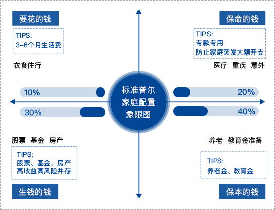 合理有效的资产配置是持续增长财富的前提。“资产配置”不分财富多少,是一种重要能力。为了配置更大、更多、更好的资源,在楹进集团看来资产配置的思想是最不可缺少的。下图是标准普尔曾调研全球十万个资产稳健增长的家庭,分析总结出他们的家庭资产配置方式,从而得到标准普尔家庭资产象限图。此图被公认为最合理稳健的家庭资产分配方式。
