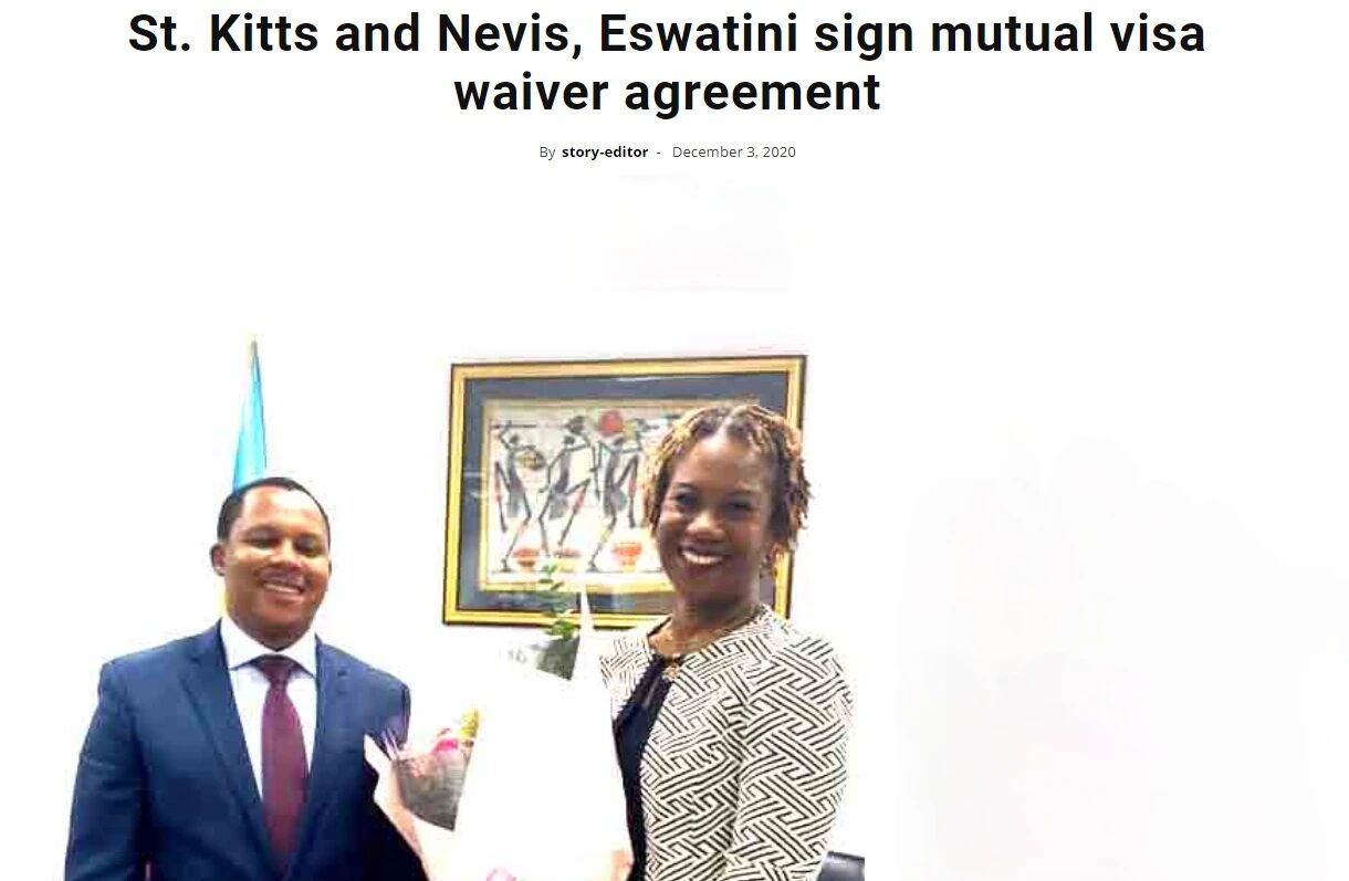 据StKittsNevisObserver网站12月3日新闻报道,圣基茨和尼维斯大使Jasmine Huggins与斯威士兰(埃斯瓦蒂尼)大使Thamie Dlamini签署了一份双方国民互免签证要求的谅解备忘录。