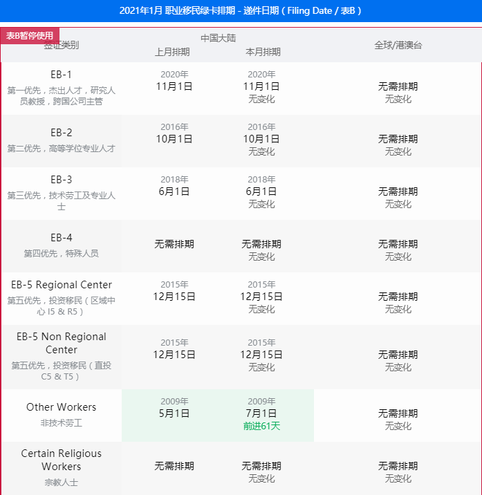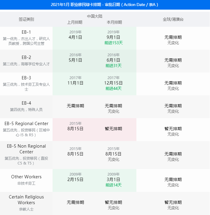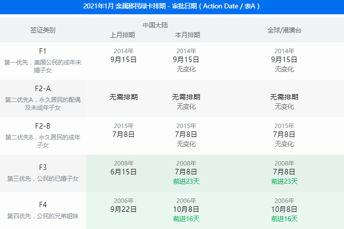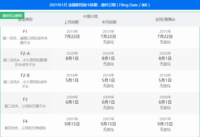 根据移民法案,每年可发放的绿卡数量是有限的,所以申请人需要要排队等候审批。表A显示的日期,即为绿卡申请审批到达此日期前递交的申请人。