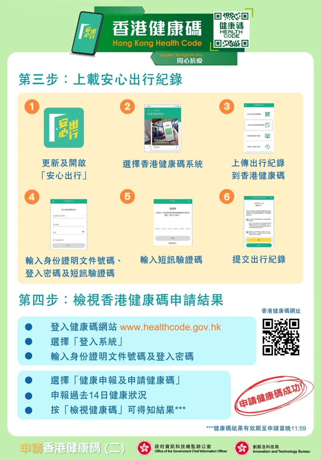 “港康码”系统今日9时正式开通,申请前市民要先更新“安心出行”至3.0版本,再到网站实名登记申请注册帐户。成功开通帐户后,用户可透过“安心出行”3.0版本,上传出行纪录到“港康码”系统,输入身份证明文件号码、登入密码及短讯验证码,然后于“港康码”网站登入系统获取“港康码”。