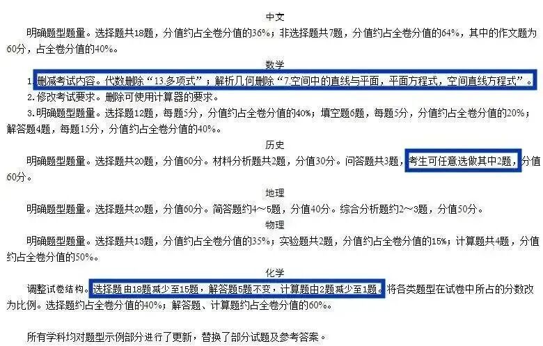 1、删减考试内容。代数删除“13.多项式”;解析几何删除“7.空间中的直线与平面,平面方程式,空间直线方程式”。