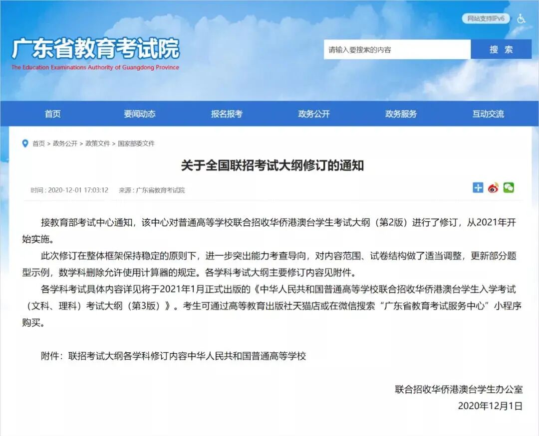 12月初,广东省考试院印发了《关于全国联招考试大纲修订的通知》,就2021年华侨港澳台联考大纲进行了修改。