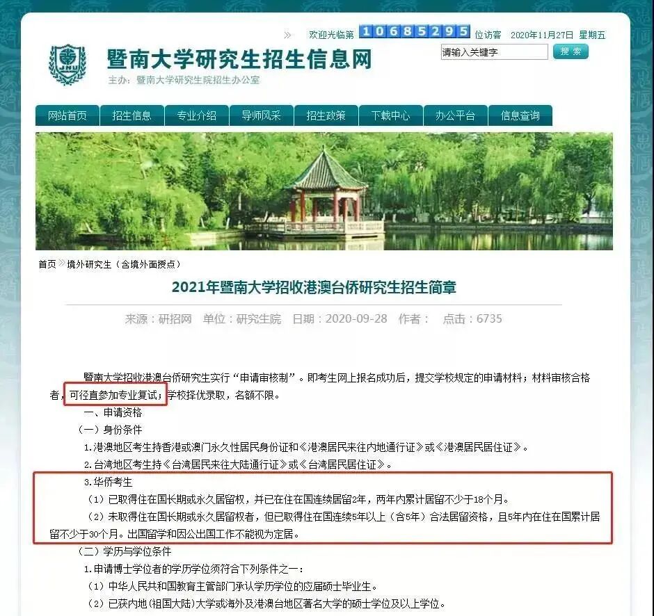 2020年9月,暨南大学发布《2021年港澳台侨研究生招生简章》,与往年只招收本科不同的是,此次是该学校首次对外公开针对港澳台华侨生招收硕士研究生!