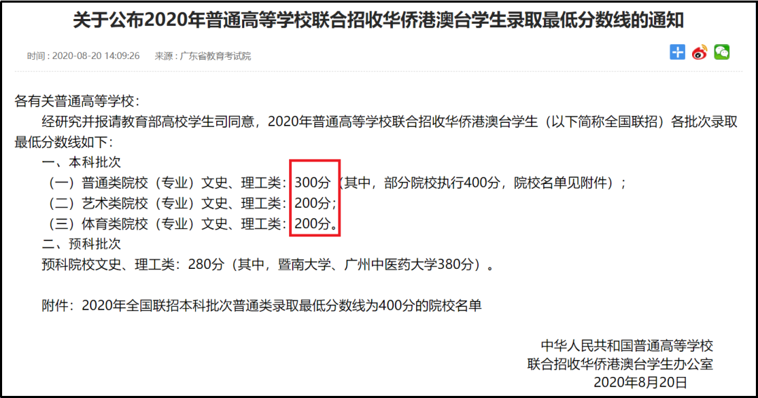 2020年华侨生联考录取分数远低于国内普通高考的录取分数线(平均低至少150分以上),400分即可入读一本大学,二批本科院校只需300分左右,比普通高考平均低出将近270分。