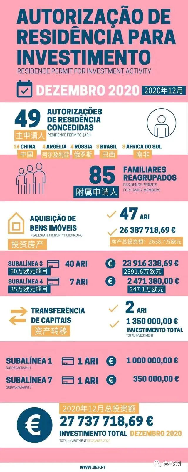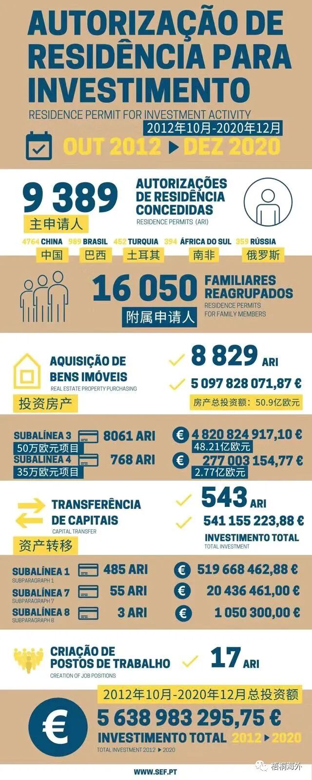 年终统计数据显示,葡萄牙2020年共计签发了1182个黄金签证,这一数字略少于2019年的1245个,在严峻的疫情和严格的出入境限制之下,葡萄牙黄金签证还能取得如此出色的成绩,证明了其对投资者的非凡魅力。通过黄金签证,葡萄牙去年吸引到了6.467亿欧元的投资。从12月份的数据来看,该月共计49位主申请人和85位附属申请人获批葡萄牙黄金签证,投资额为2773.7万欧元。其中,大部分投资人——49位中的47位——是通过购房移民的方式获得的,其中90.6%的资金流入了50万欧购房移民项目,9.4%的资金流入了35万欧的旧房翻新项目。另外两位客户则通过基金投资等方式获得身份的。这显示出,投资者仍对葡萄牙升值潜力出众、租金回报理想、利于税务规划与财富传承的房地产项目有较强的兴趣。葡萄牙自于2012年10月8日黄金居留许可政策开放,到现在已经走过了8个年头。在这短短的8年的时间里,葡萄牙黄金居留项目共发放了25439张黄金居留卡,总投资额达到约56.38亿欧元!其中房产投资占约90%的比重,成为了吸引投资的重要力量,基金投资和工作居留占比10%。未来由于黄金签证政策已经发生变化,里斯本大区、波尔图大区退出黄金签证政策。作为快速移民葡萄牙的35万欧元基金项目(不受新政地区限制),终将成为投资者追捧的热点!无需出国考察,投资人国内即可办理全部移民流程。葡萄牙作为欧洲最早开放黄金签证移民项目的国家,黄金居留的稳定政策,使其成为了全世界投资人最佳投资地之一。其中排名前五位的国家分别是:中国、巴西、土耳其、南非、俄罗斯。即将终止的里斯本和波尔图两地的黄金签证政策还有为期6个月的“窗口期”,加上葡萄牙房产投资市场在新冠肺炎疫情中不降反升的趋势,不少的海外投资人都希望能抓住这最后的“窗口期”尽快入场。免责申明:文章部分图片来源于百度等常用搜索引擎,所有转载的文章、图片、音频视频文件等资料知识产权归该权利人所有,但因技术能力有限无法查得知识产权来源而无法直接与版权人联系授权事宜,若转载图片可能存在引用不当或版权争议因素,请相关权利方及时通知我们,以便我方迅速删除相关图文内容,避免给双方造成不必要的损失。