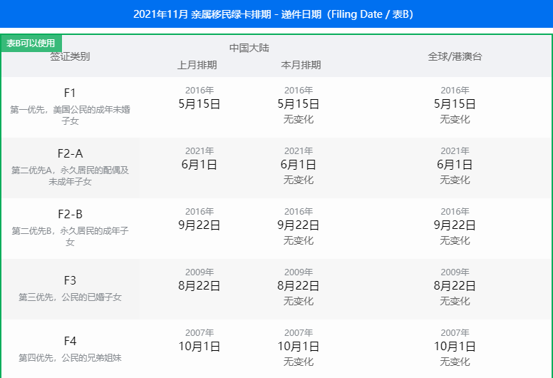 亲属移民表A:除F2A类(永久居民的配偶及未成年子女)无需排期,有名额外,其他均原地踏步。