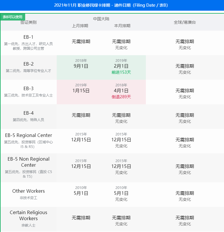 职业移民表A:EB1(杰出人才)无需排期,有名额、EB2(具高等学位或特殊能力者)前进137天、EB3(技术类专业劳工)倒退292天、非技术劳工前进28天、EB4无须排期,有名额、EB5(区域中心)暂无排期、EB5(直投)原地踏步。
