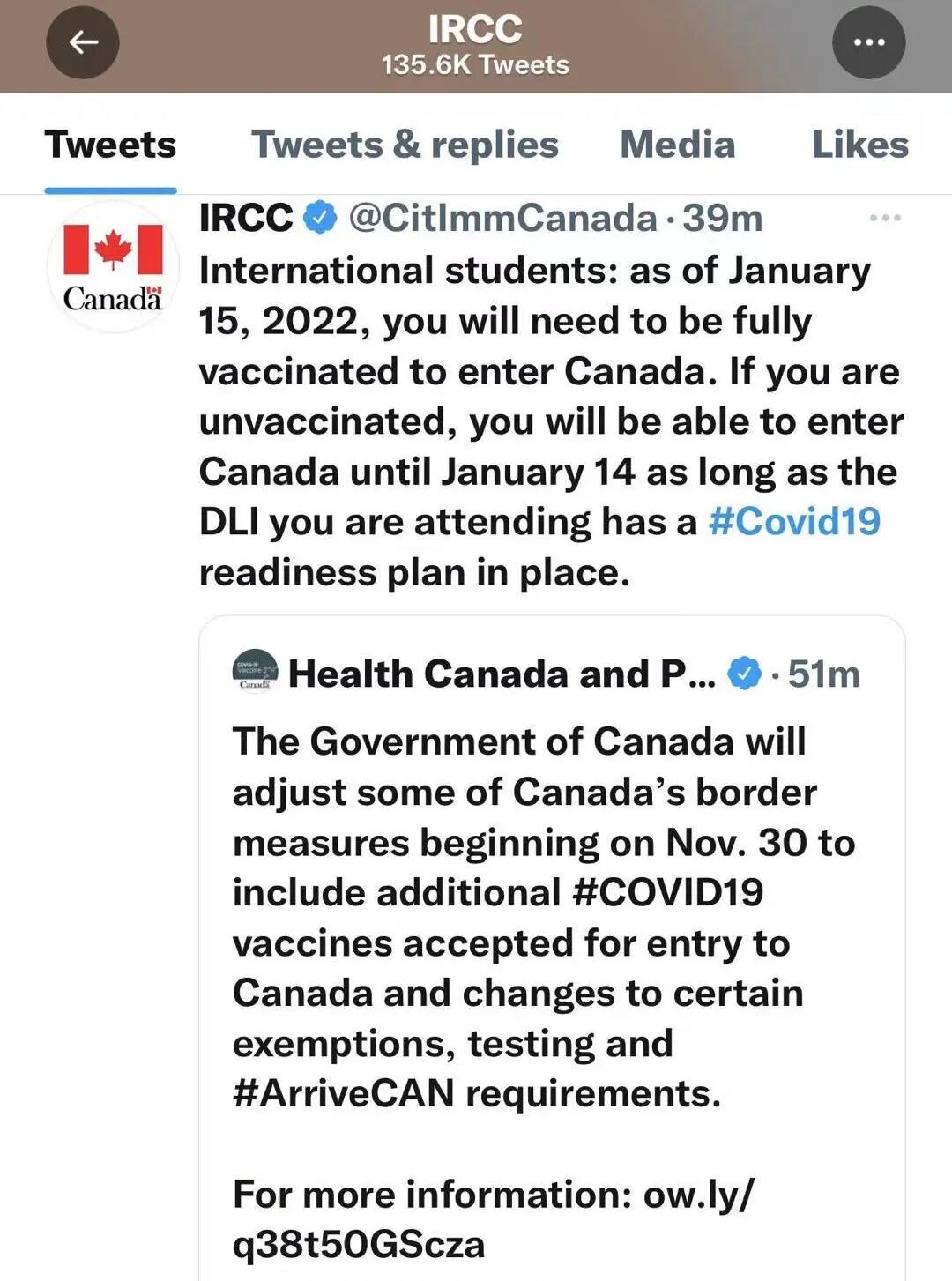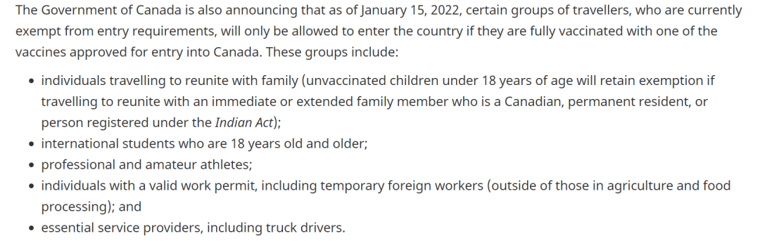 加拿大政府还宣布,从2022年1月15日起,某些目前免予入境要求的旅行者群体,只有在完全接种了批准入境加拿大的疫苗之一的情况下,才会被允许入境。年满18岁的国际学生就在列哦~
