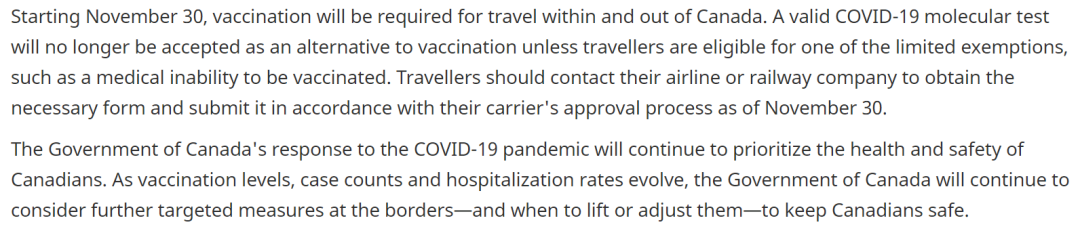 此外,从11月30日开始,在加拿大境内外旅行都需要接种疫苗!有效的COVID-19分子检测将不再被接受作为疫苗接种的替代方案,除非旅行者有资格享受豁免,如因医学原因无法接种疫苗。旅客应在11月30日之前联系航空公司或铁路公司获取必要的表格,并按照承运人的审批程序提交相应文件。