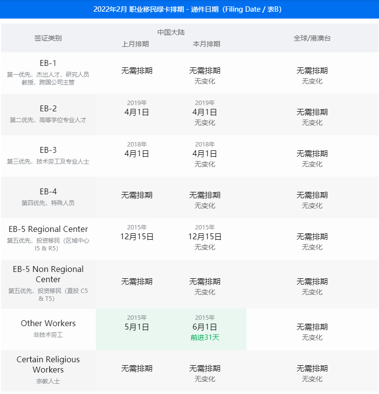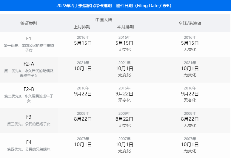 2022年2月亲属移民排期表B中,所有排期均较上月无变化。