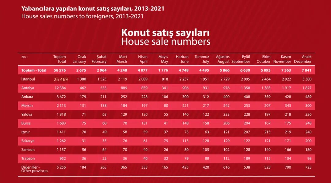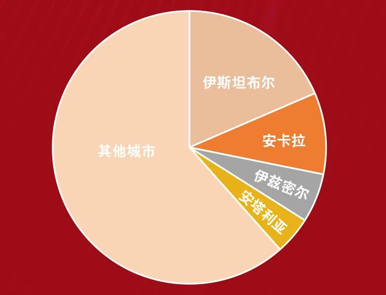 2021年,外国投资者共从土耳其购置58,576套房产,其中伊斯坦布尔共售出26,469套房产,占比45.2%,销售份额占据各大城市之首。