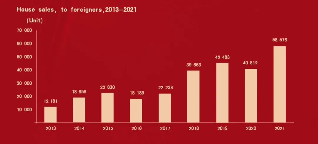 自2013年以来,外国人在土耳其购置房产的数量持续上升。2021年外国人在土耳其购置房产的数量对比2020年增长43.5%,达58,576套,占土耳其房产总成交量的3.9%。由此可见,土耳其本地房产市场非常活跃,海外房产市场潜力无限。
