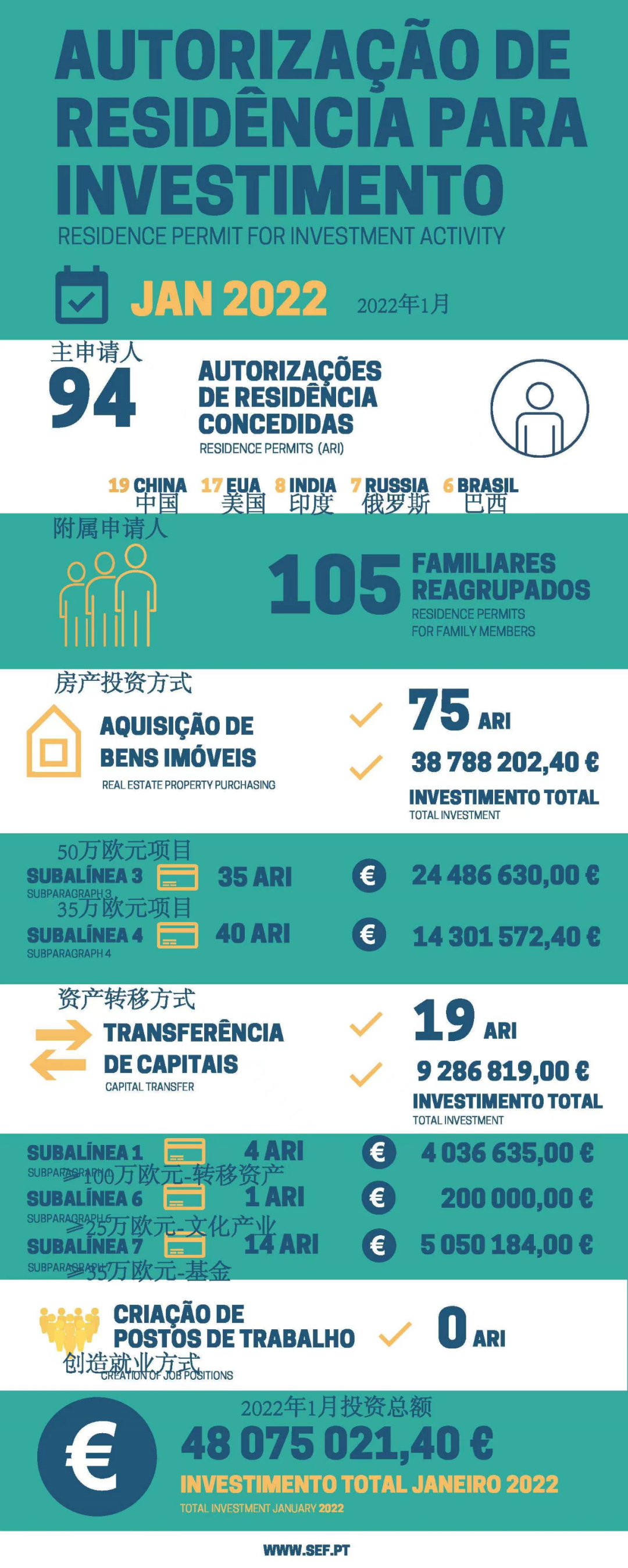 2022年1月是葡萄牙移民新政执行的第一个月,根据葡萄牙移民局(SEF)最新公布的数据:1月有94位主申请人和105位附属申请获批葡萄牙黄金签证,总投资额4807万欧元。与2021年同月相比,该值增加45%,与2020年同月相比,增加6%,环比增长14%。