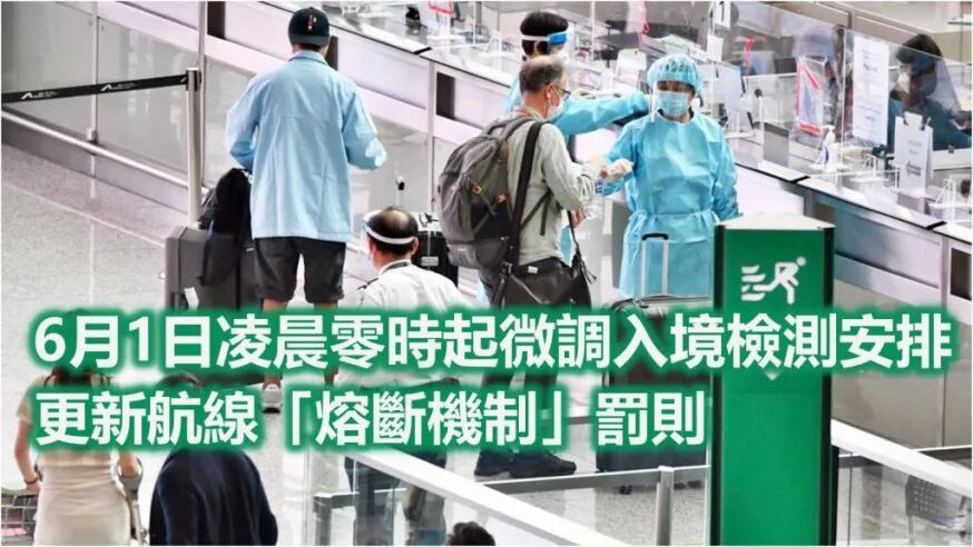 另外,港府公布,6月1日凌晨零时起,微调海外地区和台湾登机来港人士的登机前及抵港后的核酸检测安排,并新增航线熔断机制的罚则。