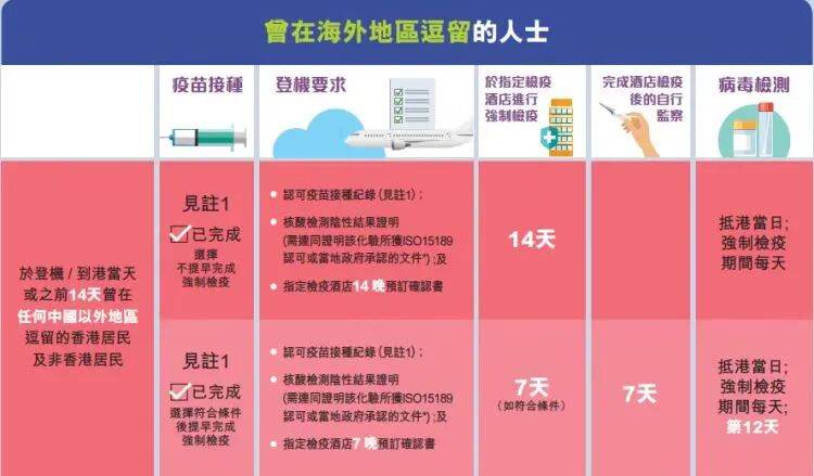 注意!香港会按照出发国/地区疫情风险等级,实施14天集中隔离或7天隔离+7天监测,但是如果没有接种疫苗或者没法提供登机前48小时核酸,一律隔离14天。