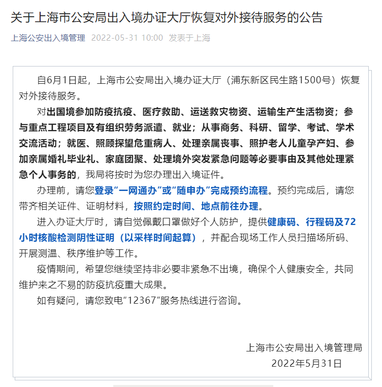5月31日,上海公安出入境管理局官宣6月1日起上海市公安局出入境办证大厅恢复对外接待服务,对商务、留学、就医等个人事务的将按时办理出入境证件。
