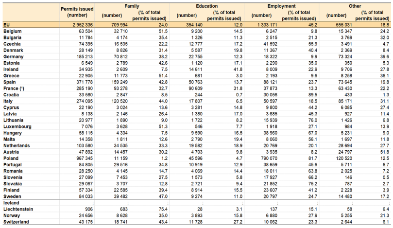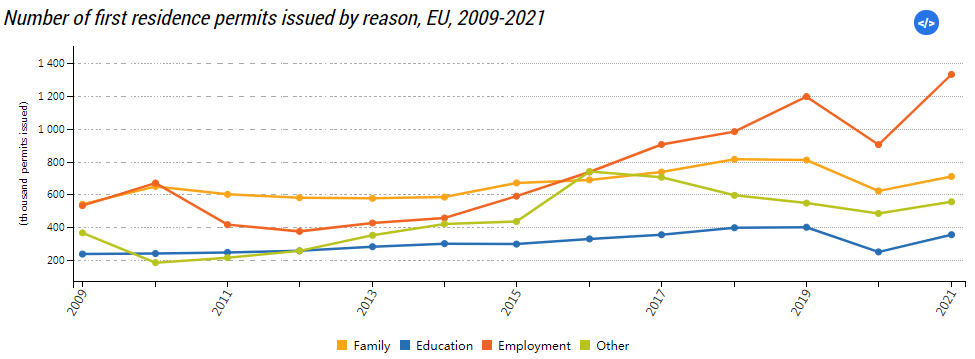 欧盟统计局在报告中将发放居留许可的主要原因归类为:工作、家庭团聚、教育和其他(包含国际庇护、不允许工作的退休居留等)。