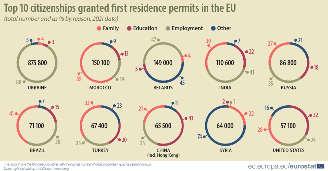 涨势惊人的欧盟首次居留许可签发给了谁呢?前十大国家和地区分别是:乌克兰、摩洛哥、白俄罗斯、印度、俄罗斯、巴西、土耳其、中国(包括中国香港)、叙利亚、美国。