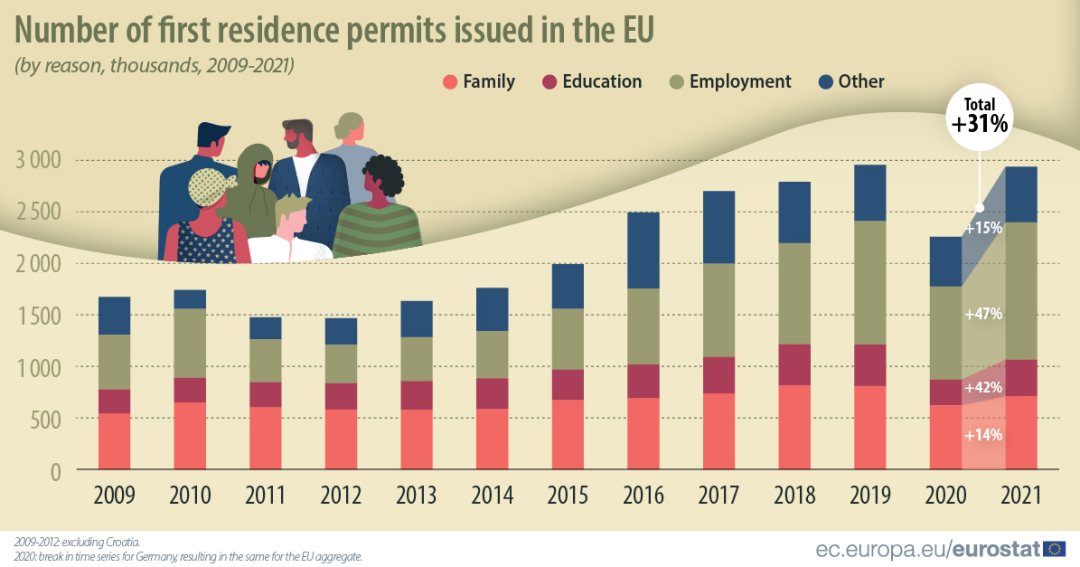 欧盟统计局发布报告显示,2021年欧盟向非欧盟国家公民签发近300万张首次居留许可,签发量与2020年相比飙升31%,重回疫情前2019年的水平。