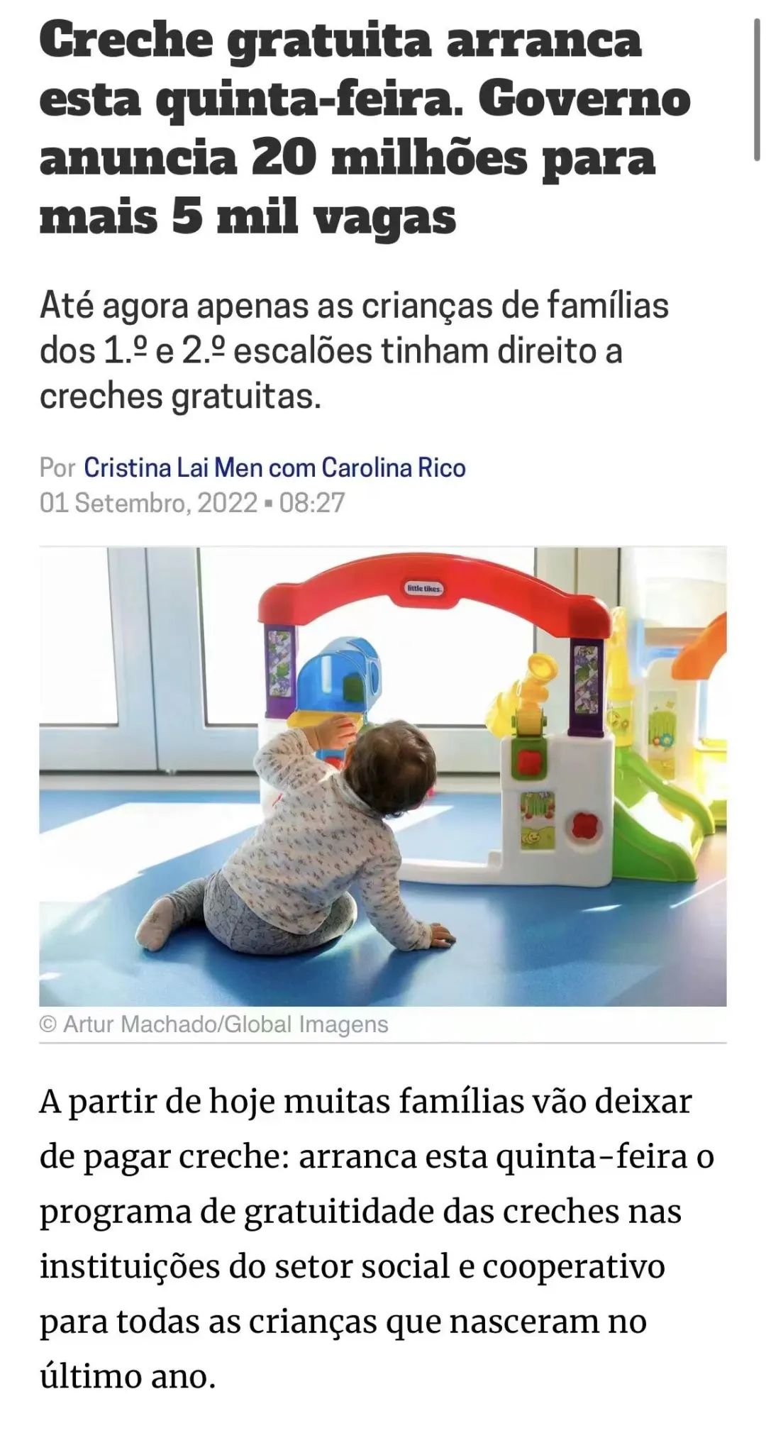 据葡萄牙媒体最新消息,葡萄牙托儿所9月1日起将全部免费,葡萄牙政府耗资2000万欧元为超过5000名儿童免除1-2阶段托儿所全部费用,所有在葡出生的适龄孩子都可以享受这一政策。