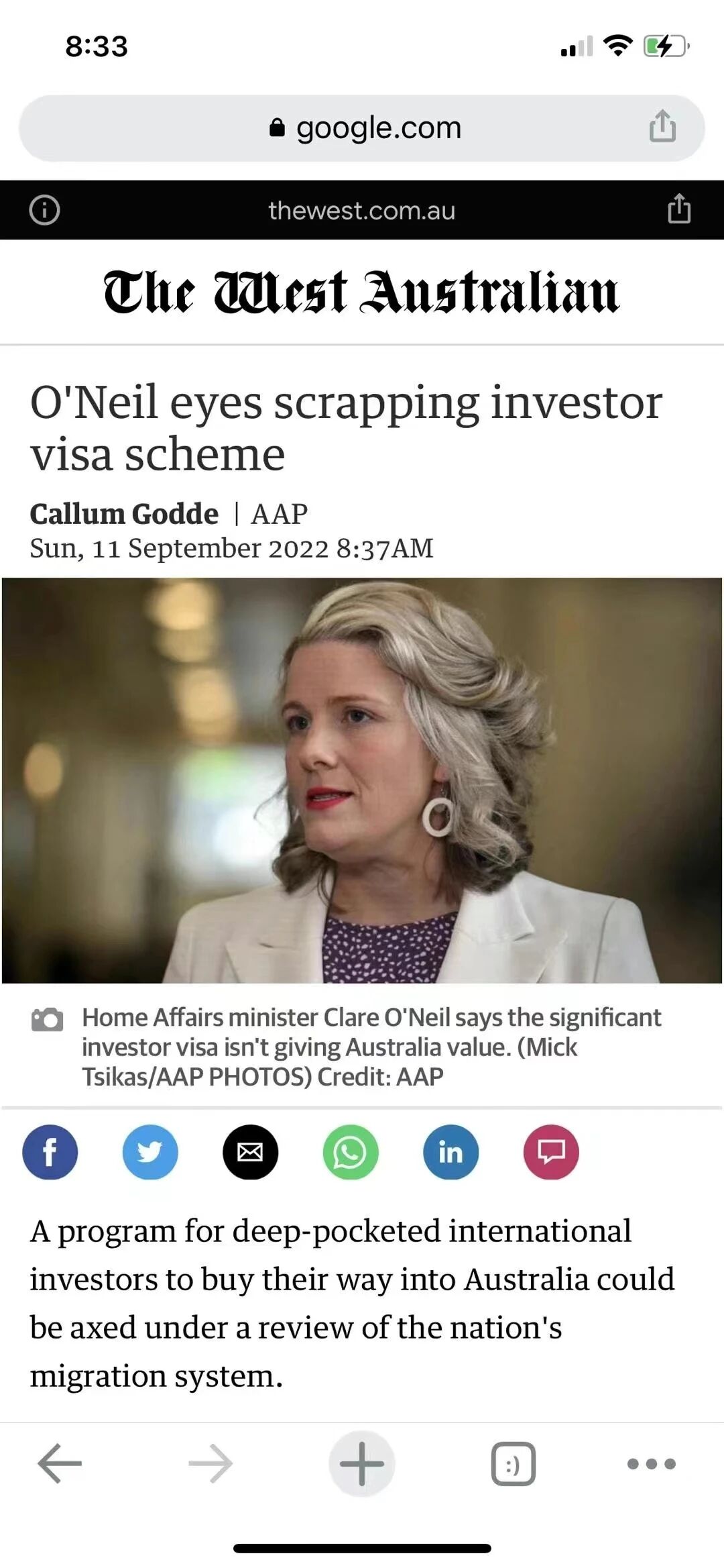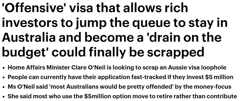 该计划由Gillard政府于2012年推出,内政部长Clare O'Neil表示,这个移民类别已经成为一个问题。