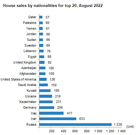 在2022年8月份中,俄罗斯仍旧作为购房的主力军,购买了1238套房产,遥遥领先于其他国家。此外,中东,德国,美国,英国等国家也相继在土耳其购置房产。