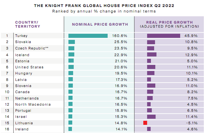 全球性地产咨询公司Knight Frank发布的2022第二季度报告称,土耳其房价以160%的涨幅遥遥领先与其他国家。俄乌冲突引发的海外富豪集体避难,外国投资者的涌入造成供不应求等等原因都导致房价的增长幅度不断上升。