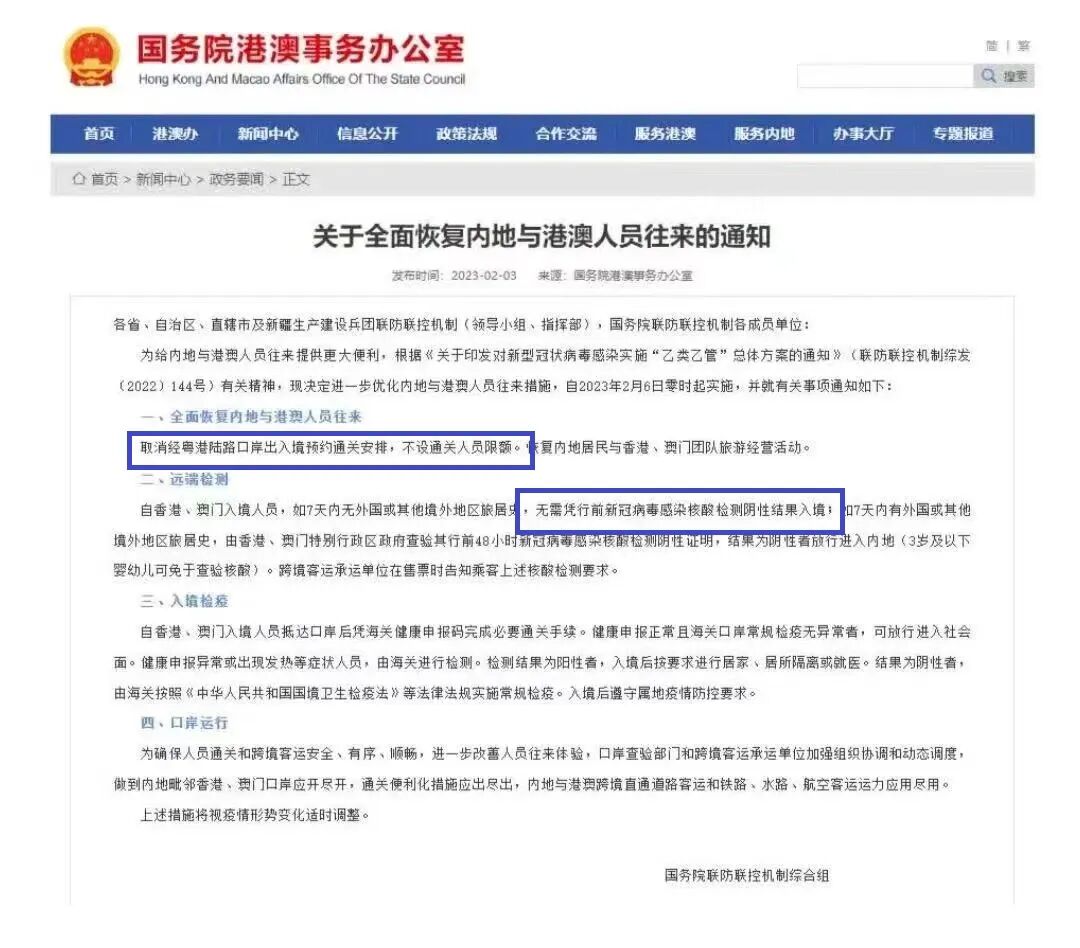 据国务院港澳事务办公室:2月6日零时起,全面恢复内地与港澳人员往来。取消经粤港陆路口岸出入境预约通关安排,不设通关人员限额。恢复内地居民与香港、澳门团队旅游经营活动。