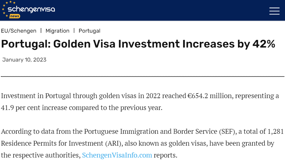 根据葡萄牙移民与边境服务局 (SEF) 先前公布的数据显示,去年通过黄金签证计划向葡萄牙投资的资金达 6.542 亿欧元。SEF强调,与2021年的数字相比,2022年的数字总共增长了41.9%。