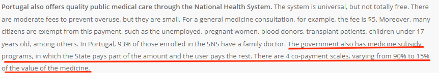 葡萄牙免费的公共医疗体系,该体系能覆盖大部分的免费医疗系统,且18岁以下的孩子和65岁以上的老人能够享受100%免费的公共医疗。政府也有药品补贴计划,国家支付部分金额,用户支付剩余金额。共有四种共同支付比例,从药物价值的90%到15%不等。
