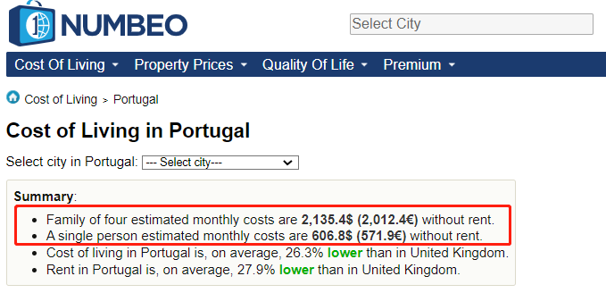根据NUMBEO网站的数据显示,葡萄牙的四口之家的每月预计支出为2135.4美元(不包括房租),且单人生活的每月预计支出为606.8美元(不包括房租)。