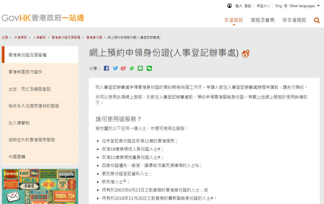 注意,上述安排只适用于已持有香港身份证的申请人。年满11或18岁的市民如从未登记身份证,须预约一般人事登记服务时段以办理首次登记身份证的手续。