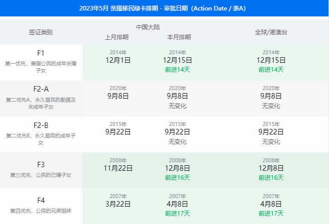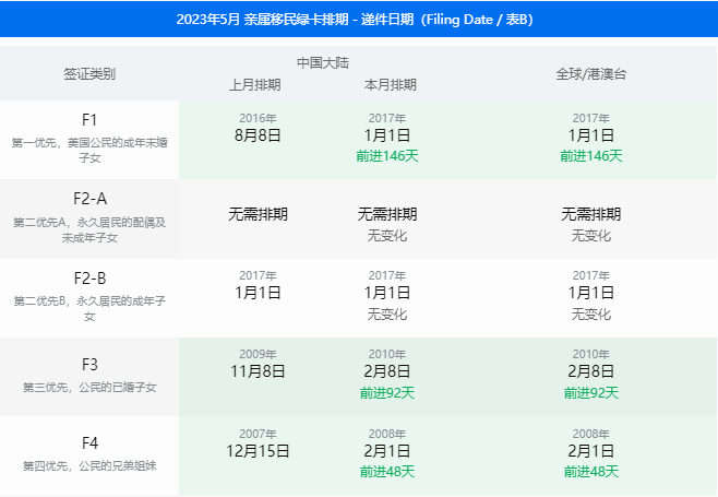 美国国务院签证办公室公布了2023年5月的签证公告(Visa Bulletin),关于职业移民和亲属移民排期表详情见以下表格。