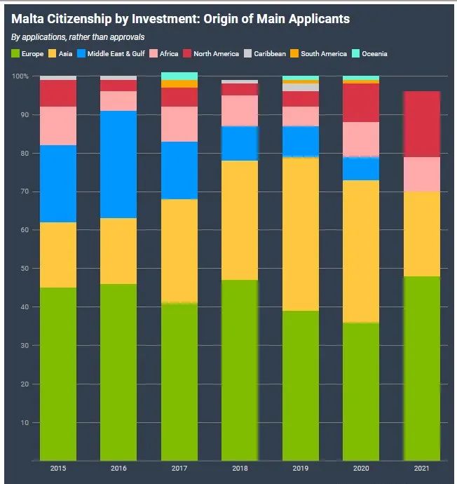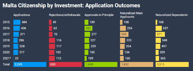 总的来看,马耳他收到了2,245宗申请案,其中1,608宗获批,630宗拒签或者撤回。总计1,452个马耳他公民身份签发给了主申请人,3,515个马耳他公民身份签发给了他们的家属。