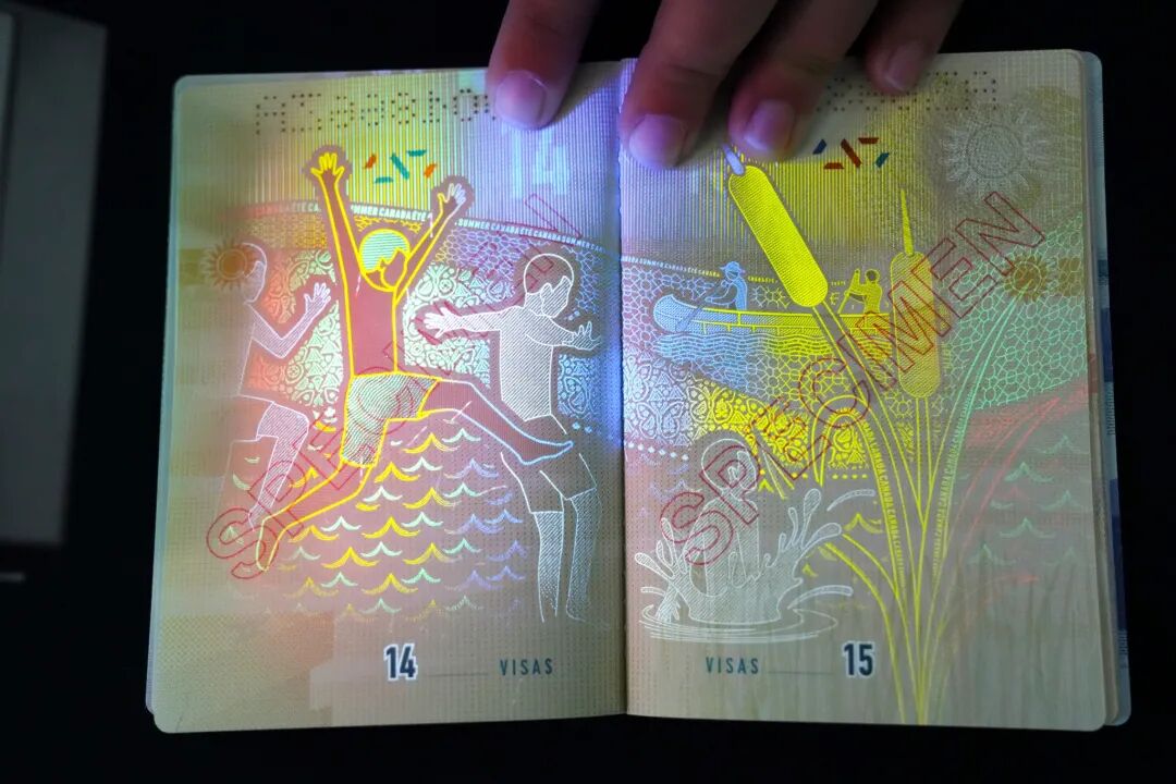 新版护照还引入了防伪功能,包括将护照芯片放置在透明塑料页面中,以便持有人可以判断是否被篡改。使用聚碳酸酯热塑性材料使得护照可以通过激光雕刻而不是油墨印刷,进一步提高了安全性。