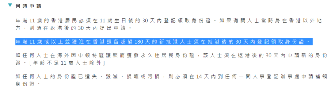 根据相关规定,11岁或以上并获准在香港逗留超过180天的新抵港人士必须在抵港后的30天内登记领取身份证。未满11岁的香港居民要在11岁生日后的30天内领取身份证,如果不在港需在返港30天内申请。