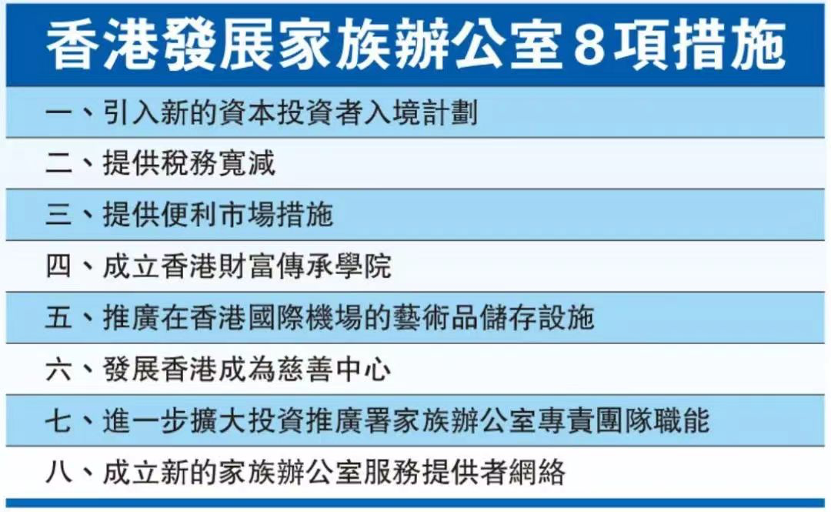 此外,值得注意的是,为全球家族办公室及资产拥有人打造具有竞争力的有利环境,并推动家族办公室行业蓬勃发展,除了启动服务网络以外,香港特区政府还推出了其他新措施,包括新的“资本投资者入境计划”、提供税务宽减、成立香港财富传承学院、推广机场的艺术品贮存设施和发展香港成慈善中心等。