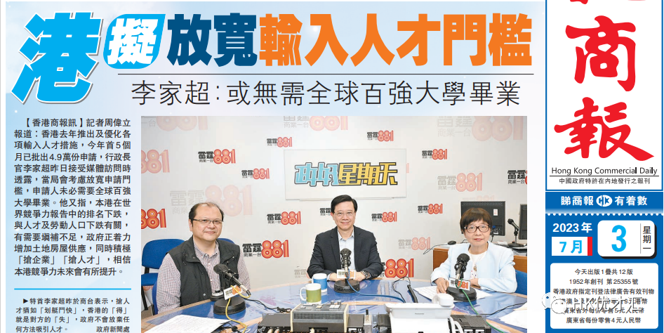 据媒体报道,7月2日,香港特区行政长官李家超接受媒体访问时表示,港府会考虑放宽申请门槛,高才通计划申请人未必需要全球百强大学毕业,希望能够引进更多有助于推动香港八大中心建设的合适人才。